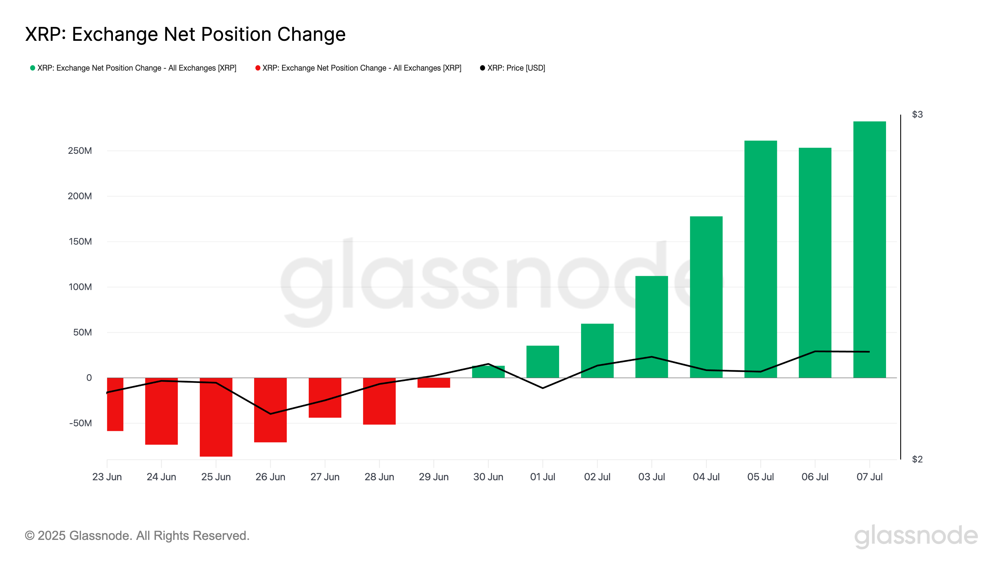 Glassnode-gegevens tonen een gestage stijging in de Exchange Net Position Change van XRP in de afgelopen week. On-chain data laat zien dat deze metriek, die de netto hoeveelheid tokens die naar gecentraliseerde exchanges verplaatst worden bijhoudt, op 7 juli steeg naar een 8-maandse high van 283 miljoen XRP.