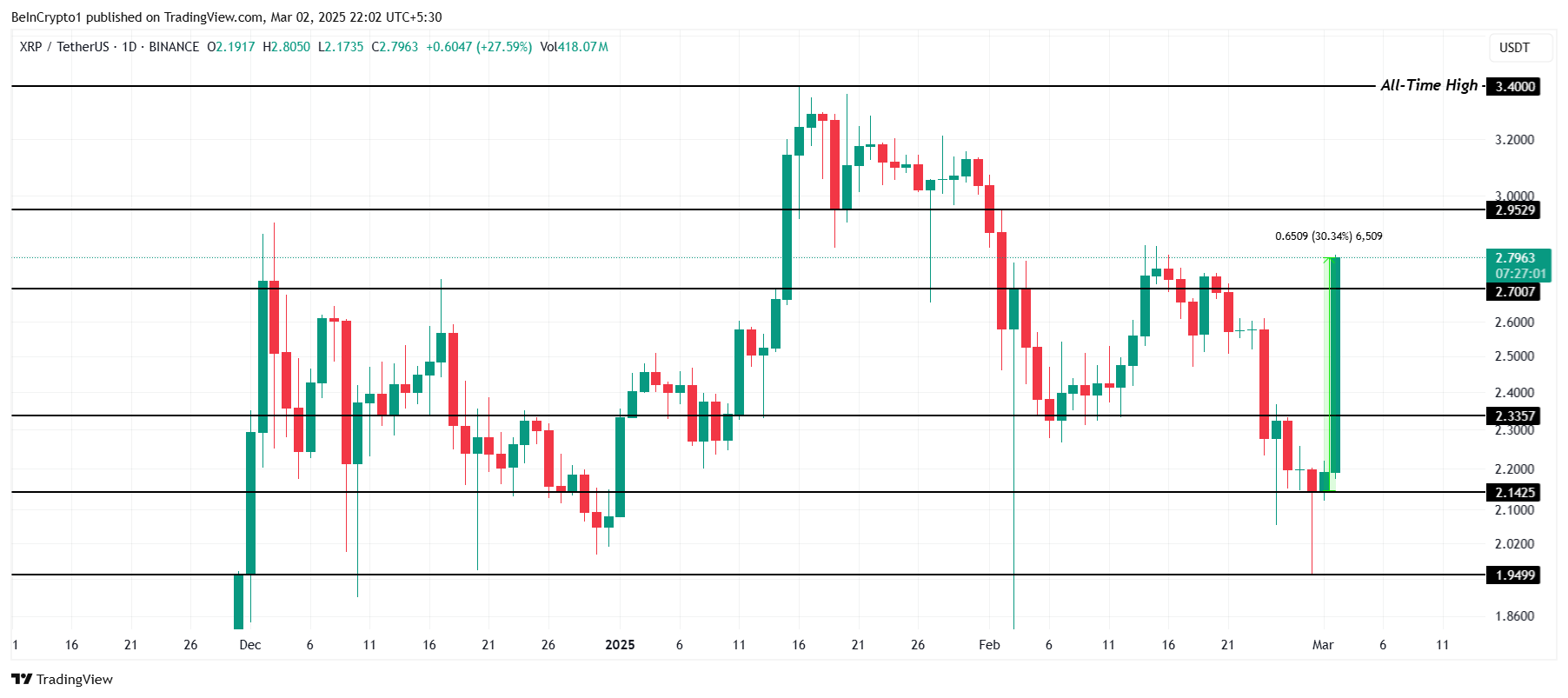 Op het moment van schrijven wordt XRP verhandeld op $2,79, wat een stijging van 30% markeert in de afgelopen 24 uur. De bullish factoren die deze rally aandrijven, brengen XRP dicht bij het doorbreken van de weerstand van $2,95. Als dit niveau wordt doorbroken, zou XRP kunnen stijgen naar $3,00, wat de weg vrijmaakt voor meer winsten.
