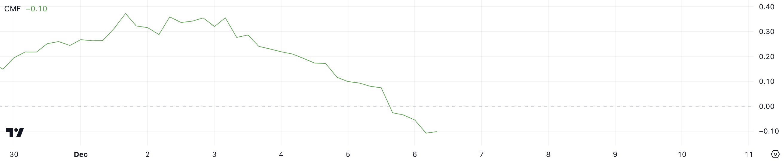 Een negatieve CMF geeft aan dat er meer geld uit de asset stroomt dan erin, wat een bearish signaal voor de koers kan zijn.