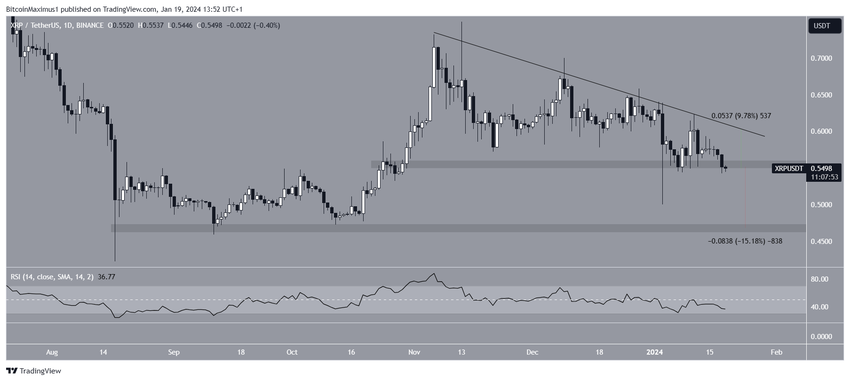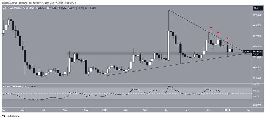 De koers toont een symmetrische driehoek op korte termijn die bestaat sinds november 2023. Als dat zo is, dan is XRP aan het afbreken van de steun op $ 0,55.