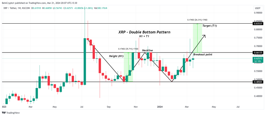 De koers van Ripple vormde de afgelopen maandeneen dubbele bodempatroon op het wekelijkse timeframe. Dit bullish omkeerpatroon wijst op de potentiële stijging die een asset kan doormaken, op voorwaarde dat het breekpunt wordt doorbroken.