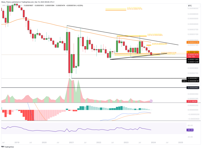In zijn handelspaar met Bitcoin (BTC) wordt XRP geconfronteerd met de mogelijkheid van een bearish doorbraak onder het Golden Ratio-steunniveau. Dit ligt op ongeveer 0,0000155 BTC. Als deze bearish beweging werkelijkheid wordt, liggen de volgende sterke steunniveaus voor Ripple naar verwachting in de range van ongeveer 0.0000124 BTC tot 0.0000134 BTC.