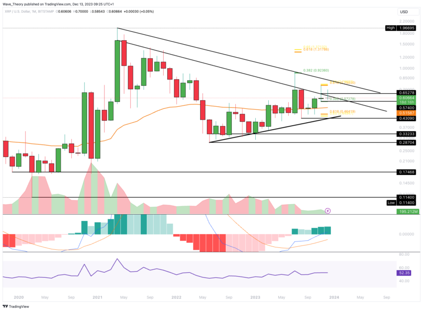 Vorige maand kreeg XRP te maken met een bearish afwijzing op het Golden Ratio-niveau, rond $0,75, wat leidde tot een correctie. De koers vond toen steun op het 0,382 Fibonacci (Fib) niveau, ongeveer op $0,573, waar het in eerste instantie opveerde. Als dit steunniveau wordt doorbroken, wordt er echter sterke steun voor Ripple verwacht bij het 50-maands Exponential Moving Average (EMA), rond $0,516.
