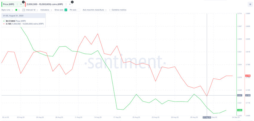 Zoals hieronder weergegeven, hadden de walvissen slechts 3.73 miljard XRP in hun cumulatieve saldi bij het sluiten van 31 augustus. Maar vanaf 4 september hebben ze hun verkoopwoede van een maand omgebogen en hun bezit verhoogd naar 3,77 miljard XRP.