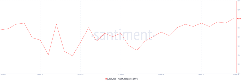 Er is een opmerkelijke stijging geweest in het aantal adressen die aanzienlijke hoeveelheden XRP bezitten, meer bepaald die met holdings tussen 10 miljoen en 100 miljoen coins. Deze stijging van 1.537 adressen op 16 maart naar 1.565 op 28 maart is een sterke stijging die wijst op een groeiend momentum onder de zogenaamde ‘whale’ investeerders. Dit gebeurt ondanks het feit dat de SEC het gemunt heeft op Ripple Labs.