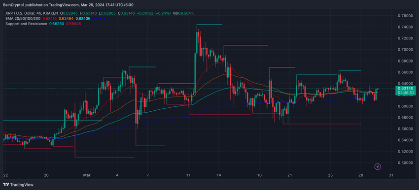 De 4 uur grafiek van de XRP koers toont een potentiële steun benchmark op $0.58. Een doorbraak van dit belangrijke niveau zou een opmerkelijke daling naar $0.51 kunnen veroorzaken, wat neerkomt op een daling van 19% ten opzichte van de huidige koers.