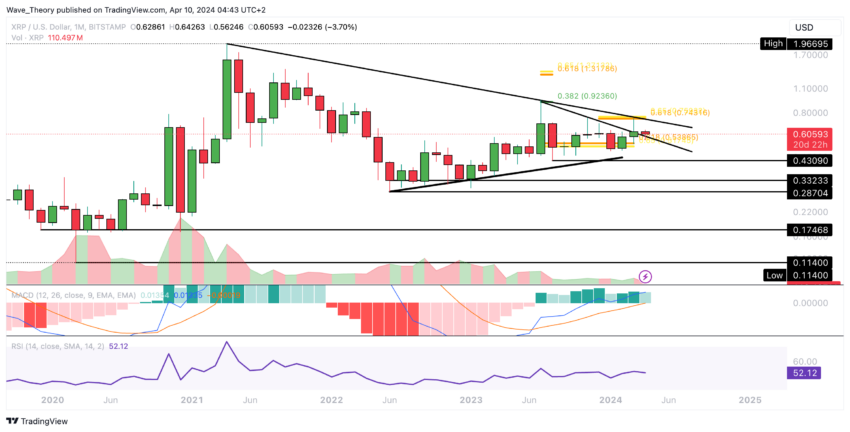 De maandgrafiek geeft een potentiële bearish trend aan, nu het MACD histogram een bearish lagere trend begint aan te geven voor de huidige maand. Dit suggereert de waarschijnlijkheid van een bearish april, gekenmerkt door een voortzetting van de aanhoudende correctie in de koers van XRP.