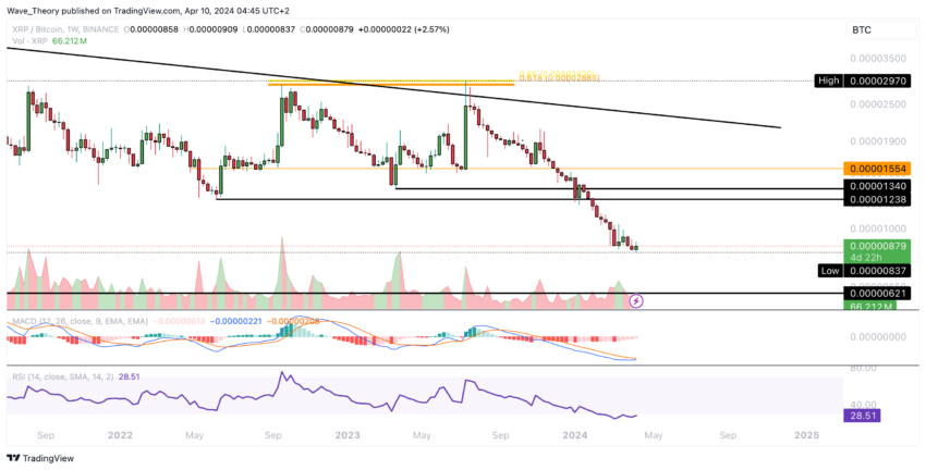 De koers van Ripple ondergaat een opmerkelijke neerwaartse trend ten opzichte van Bitcoin (BTC), met een kritiek steunniveau rond 0.0000062 BTC.