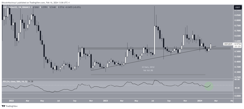 In februari 2024 brak XRP schijnbaar van zijn stijgende steun trendlijn en een lange termijn horizontaal steungebied. Op dat moment bestond de trendlijn 440 dagen.