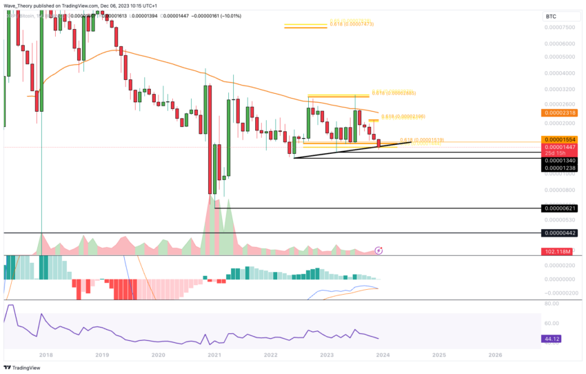 In zijn handelspaar met Bitcoin (BTC) staat XRP voor de mogelijkheid van een bearish doorbraak onder het gouden ratio support level, dat zich op ongeveer 0.0000155 BTC bevindt. Mocht deze bearish beweging plaatsvinden, dan zullen Ripple’s volgende sterke steunniveaus naar verwachting liggen tussen 0.0000124 BTC en 0.0000134 BTC.