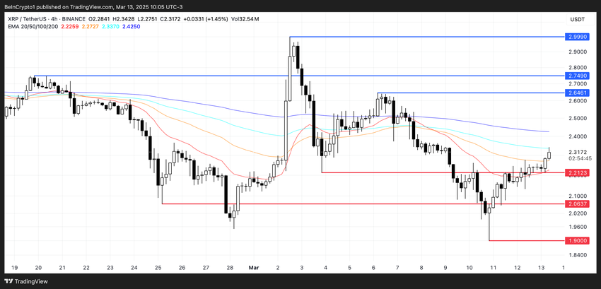 XRP’s EMA-lijnen bevinden zich nog steeds in een bearish formatie, met korte-termijn EMA’s die onder de lange-termijn EMA’s zijn gepositioneerd.