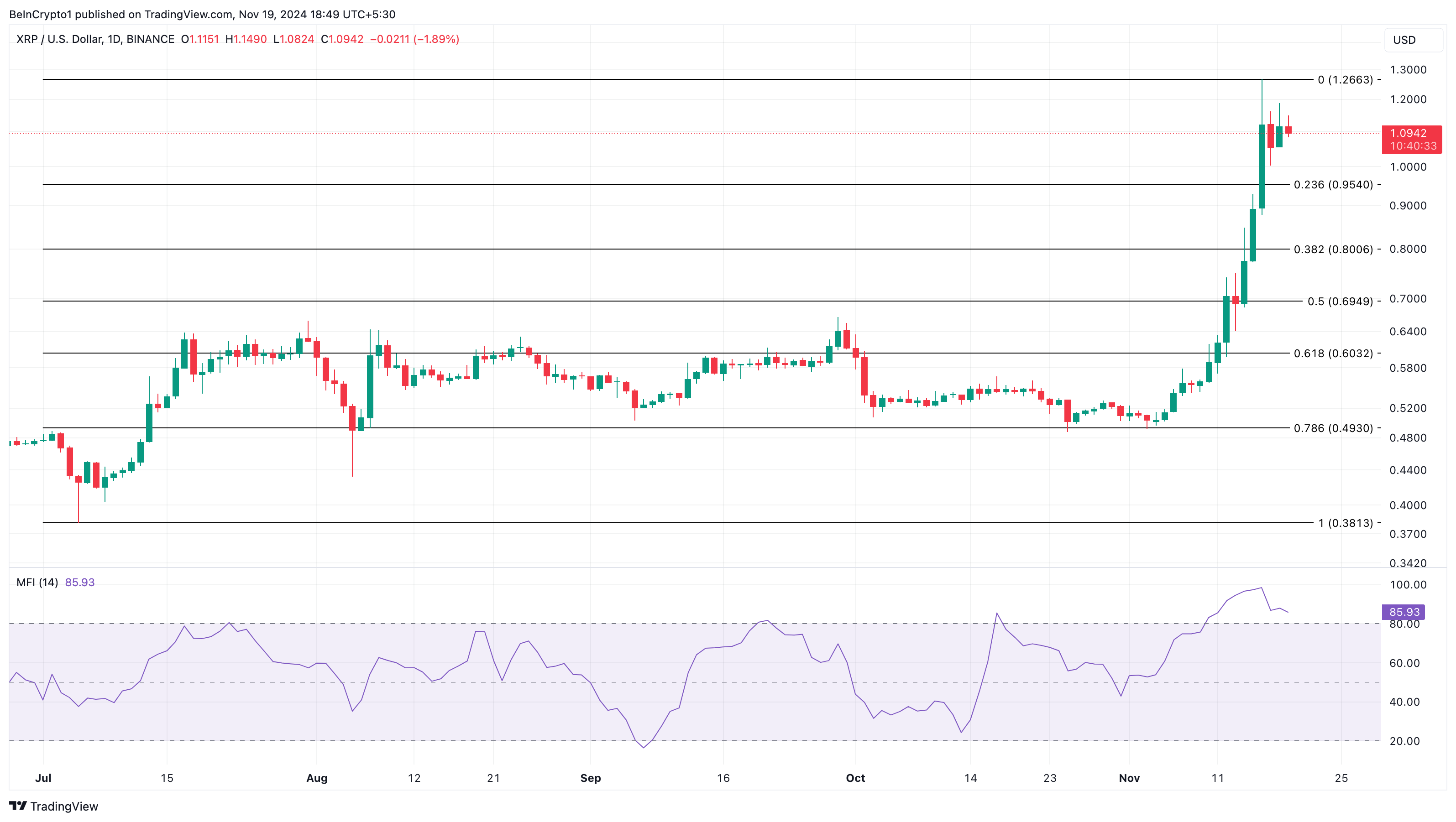 Op basis van de dagelijkse grafiek ervaarde XRP eerder een toename in koopdruk. Dit werd aangegeven door de Money Flow Index (MFI), een indicator die het niveau van kapitaal meet dat in een cryptocurrency wordt geïnjecteerd.