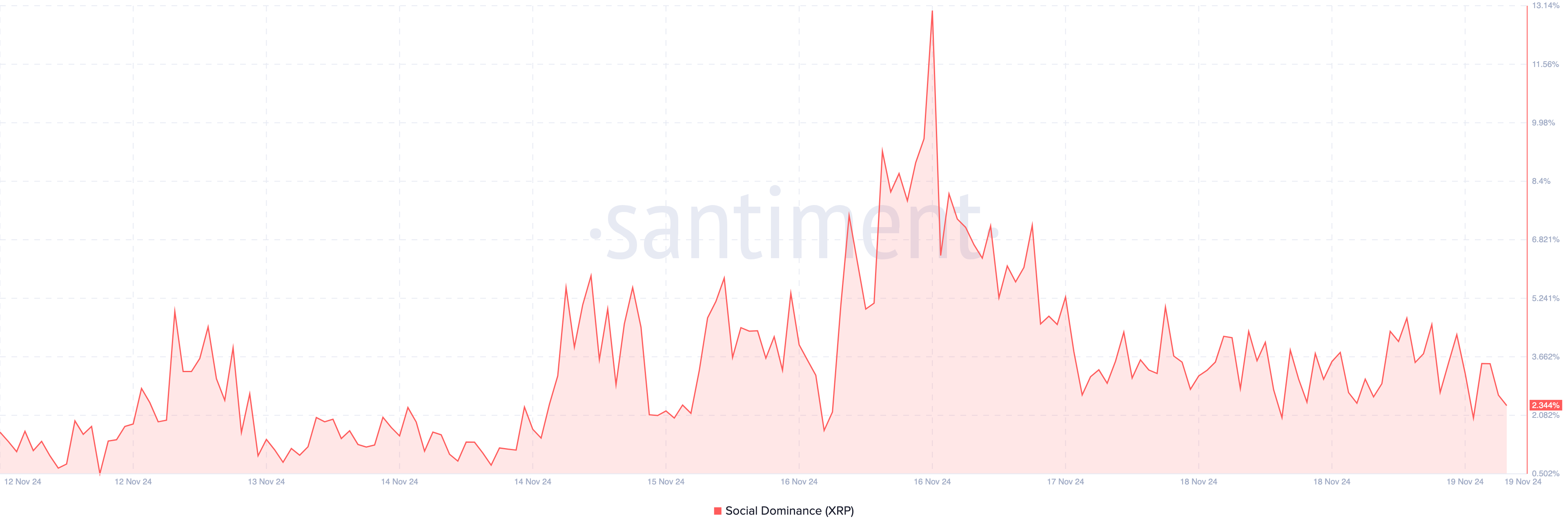 Een paar dagen geleden was de sociale dominantie van XRP bijna 13%. Op het moment van schrijven is dit gedaald naar 2,34%, wat aangeeft dat de interesse in de token is afgenomen. Mocht dit zo blijven naast de daling van het XRP-volume, dan zou de koers kunnen dalen.