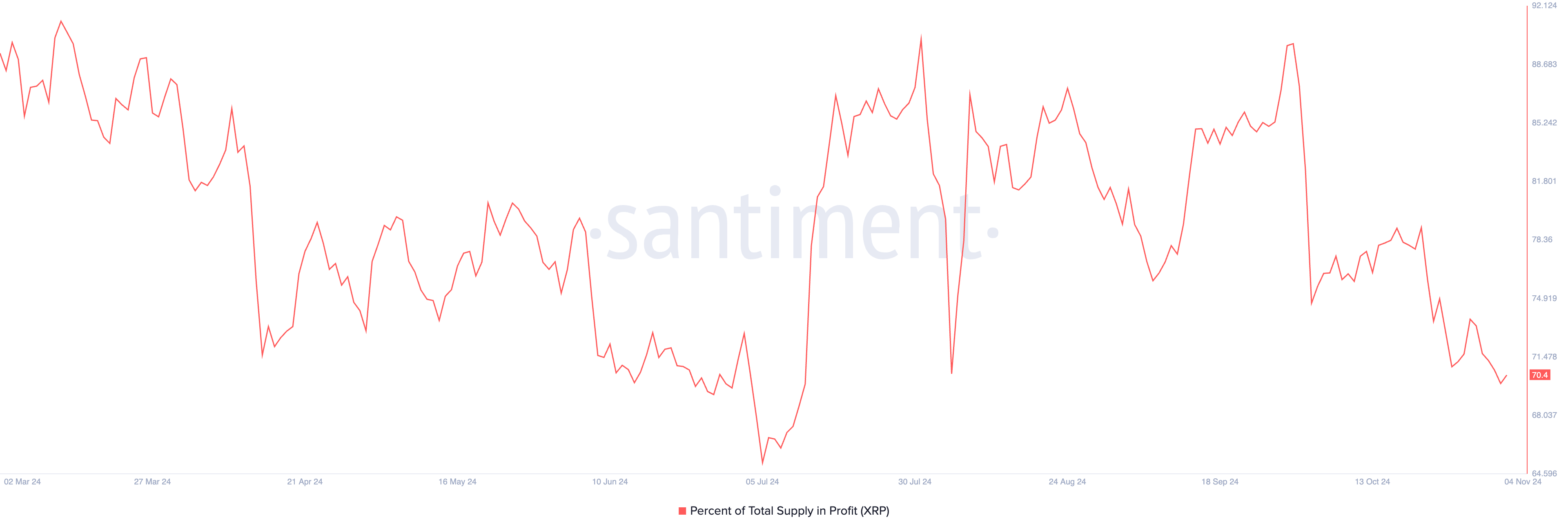 Deze koersdaling heeft geleid tot een daling van het percentage van XRP’s aanbod dat met winst wordt vastgehouden. Volgens gegevens van Santiment staat dit cijfer nu op 70,4% — het laagste sinds 12 juli. Ter vergelijking, deze metriek was 90% aan het begin van oktober, voor de kennisgeving van beroep door de SEC.