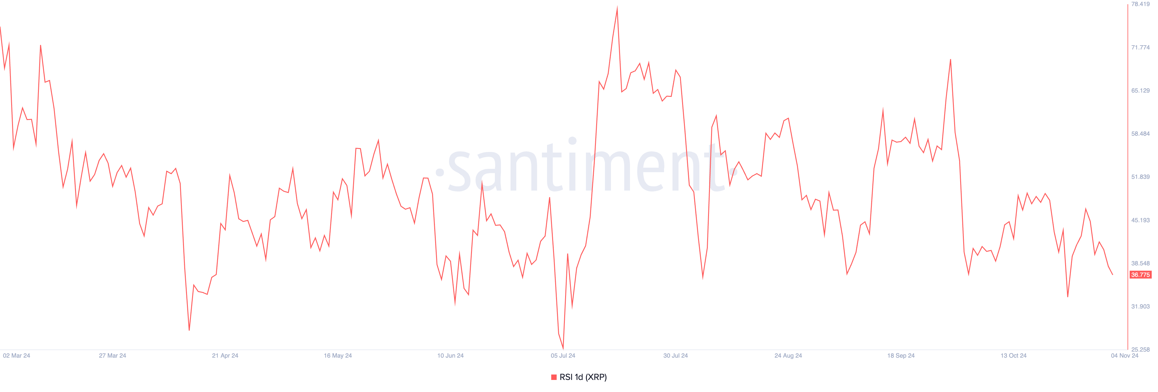 De dalende Relative Strength Index (RSI) van XRP weerspiegelt een aanhoudende toename van de verkoopdruk. Momenteel staat deze indicator, gebruikt om te beoordelen of een crypto coin oversold of overbought is, op 38,77, wat suggereert dat de verkoopactiviteit het kopen onder handelaren overtreft.
