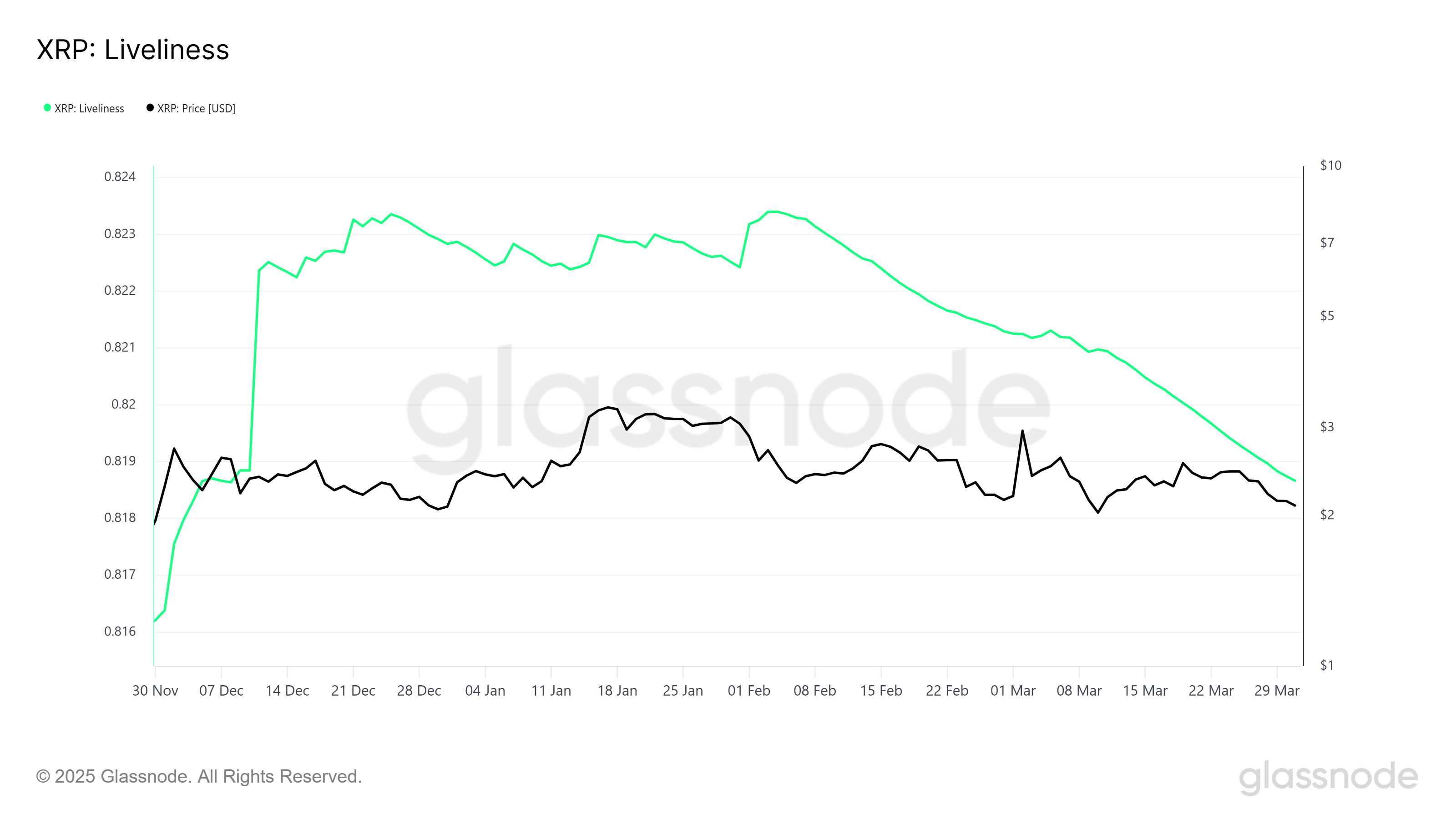 Een dalende Liveliness geeft meestal aan dat LTH’s meer van de cryptomunt accumuleren tegen lagere prijzen in plaats van te verkopen. Deze daling naar een 3-maandse low suggereert dat lange-termijn houders vasthouden aan hun overtuiging en XRP accumuleren, zelfs terwijl whale-verkopen toenemen.