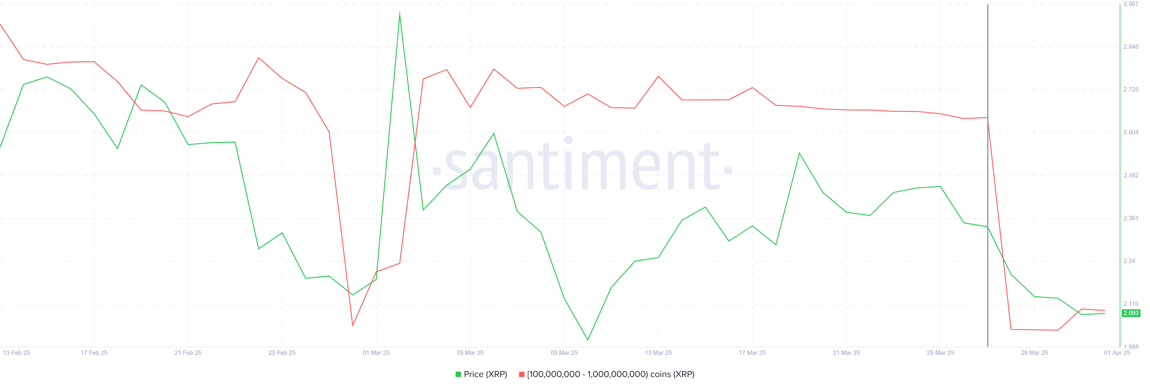 Whale-activiteit is een belangrijke factor die bijdraagt aan de recente daling van de XRP koers. Adressen met tussen de 100 miljoen en 1 miljard XRP hebben de afgelopen zeven dagen meer dan 1,12 miljard XRP verkocht, ter waarde van $2,34 miljard. Dit heeft hun totale bezit teruggebracht naar 8,98 miljard XRP.