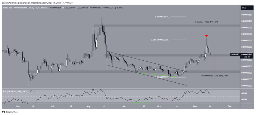 Aan de bullish kant brak de SHIB koers uit een dalend parallelkanaal. Het heroverde het $0,00000840-gebied en bereikte een high van $0,0000098. Echter werd de koers daarna afgewezen door het 0,618 Fib retracement weerstandsniveau. Het creëerde een long upper wick (rode pijl).