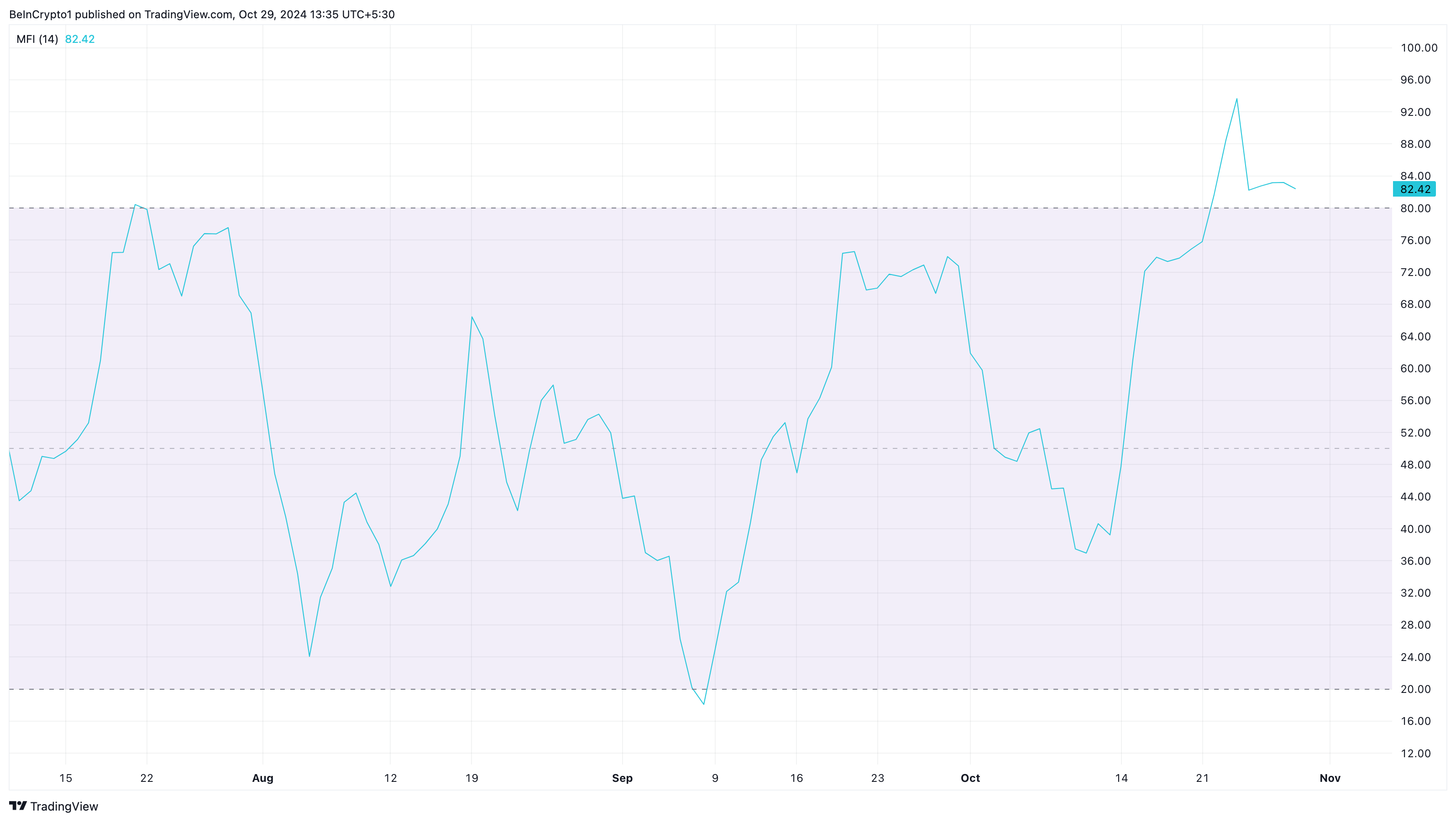 De Money Flow Index (MFI) laat soortgelijke waarschuwingssignalen zien. Momenteel staat de MFI boven de 80,00, wat bevestigt dat SOL overbought is. Een waarde onder de 20,00 zou juist wijzen op oversold-omstandigheden.