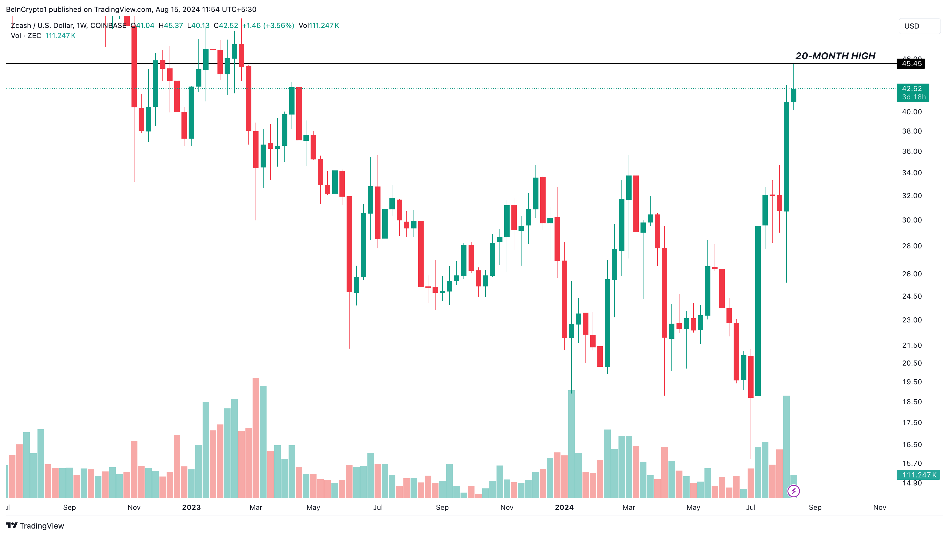 Deze koers markeert niet alleen het hoogste niveau van ZEC dit jaar, maar ook zijn piek sinds maart 2023.