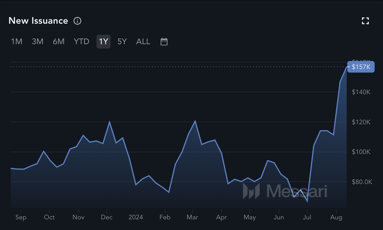 Ter ondersteuning van de zorg van de oprichter over de toegenomen voorraad, onthult data van Messari dat de nieuwe uitgifte van Zcash is gestegen naar 157.000 coins op het moment van schrijven. Op 1 juli was dit cijfer nog onder de 70.000, wat wijst op een scherpe toename van circulerende coins.