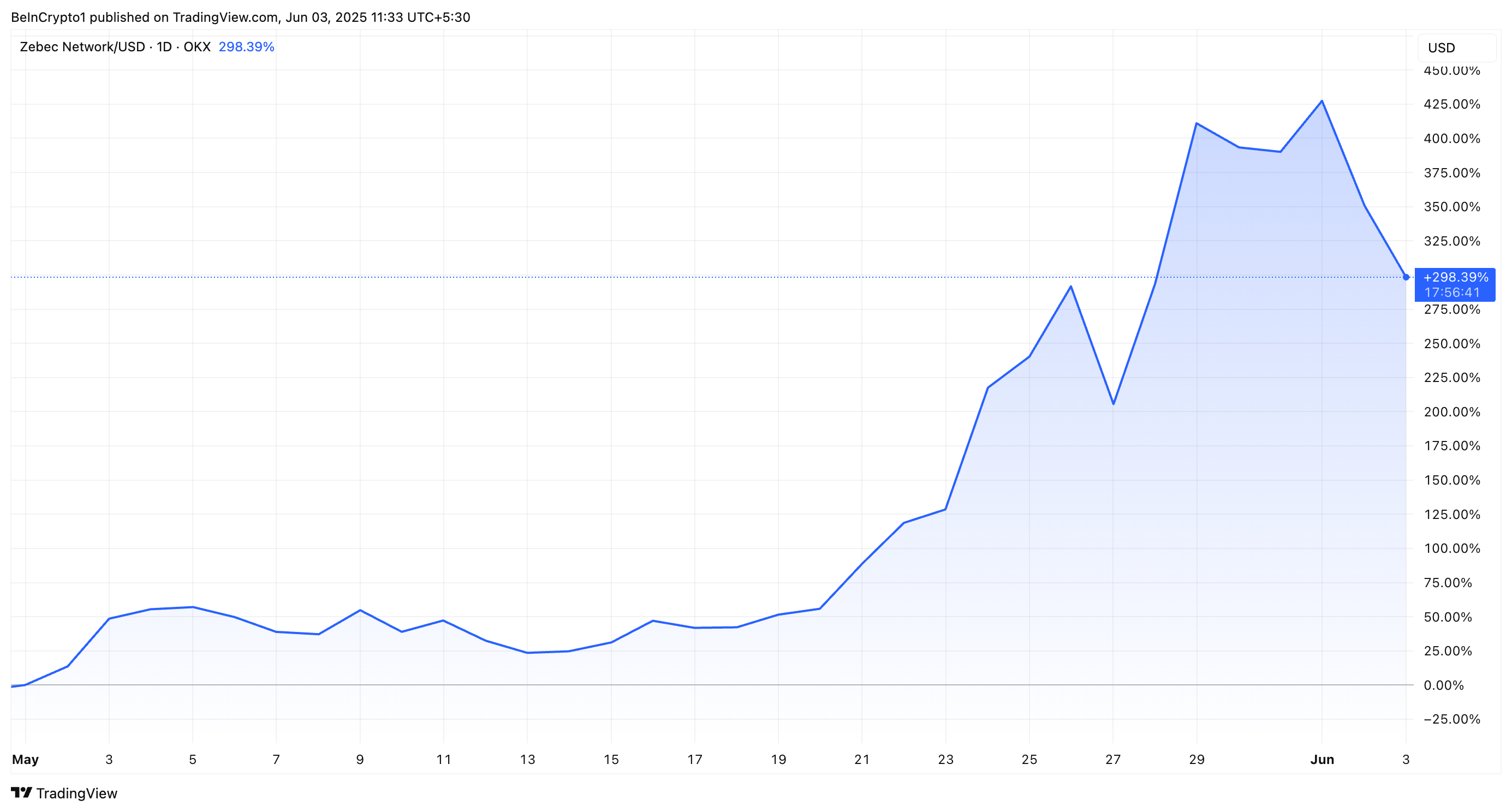 De native token van Zebec Network, ZBCN, is de afgelopen maand met bijna 300% gestegen. Ondanks een recente koerscorrectie van 27,2% na zijn recordpiek, blijft het momentum van het project sterk.