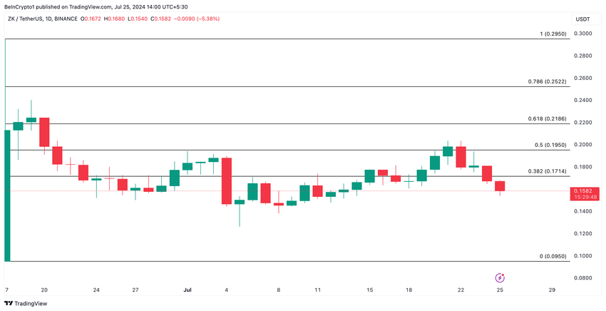 ZKsync’s native token, ZK, daalde naar een all-time low van $0,13 op 5 juli. Hoewel het sindsdien met 21% is gestegen, is de altcoin klaar om een deel van deze winst te verliezen. Op het moment van schrijven handelt ZK op $0,15, na een daling van bijna 10% in de afgelopen zeven dagen.