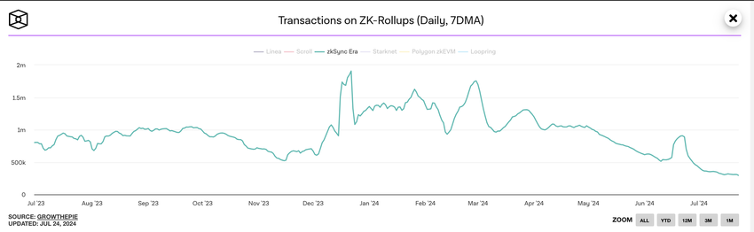 ZKsync (ZK) heeft de afgelopen maanden een sterke daling in netwerkactiviteit doorgemaakt. Het Layer-2 (L2)-protocol is getuige geweest van een scherpe daling van de gebruikersvraag en bereikte het laagste punt year-to-date.