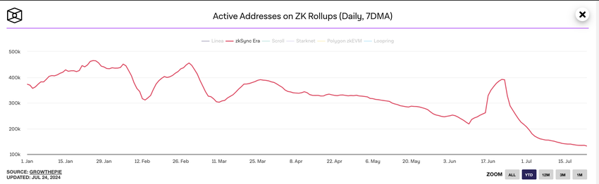 Een on-chain beoordeling van de activiteit op het ZKsync netwerk onthult een gestage daling van de vraag van gebruikers sinds 23 juni. Volgens informatie van The Block’s data dashboard, zijn de dagelijkse actieve adressen van het netwerk, waargenomen aan de hand van een zevendaags voortschrijdend gemiddelde, sindsdien met 66% gedaald.