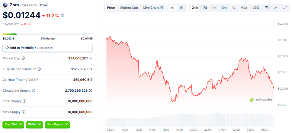 Volgens gegevens op CoinGecko is de ZORA token koers met 11,5% gedaald in de afgelopen 24 uur. Op het moment van schrijven werd het verhandeld voor $0,01244.